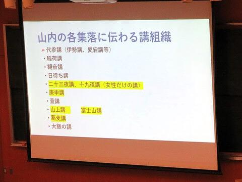 一般的な講の話から山内の集落に伝わる講組織を上げ、その一つ一つについて紹介されました。