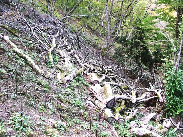 沢を隔てた斜面にはこれらを上回る太い切り株を確認した。