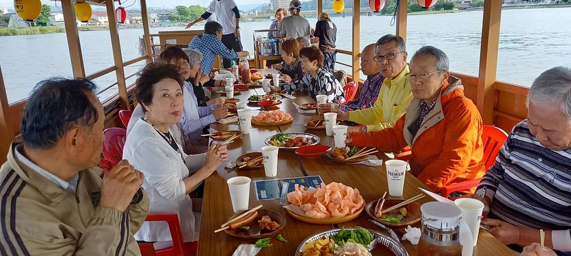(報告)5月23日のサロン終了後16時から20人が参加して新緑の瀬田川を25人乗りの大型屋形船で楽しみました(写真)