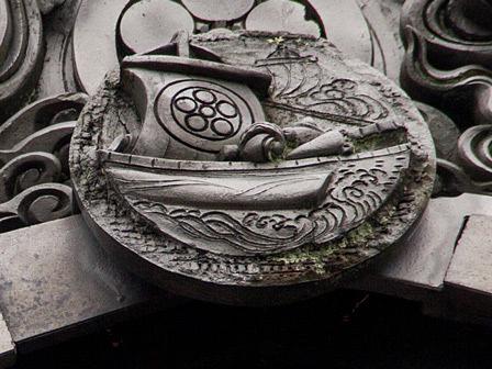 高いところにある棟瓦の鬼瓦の先に「丸子船」らしき小さな丸い瓦がみえたが、何が描かれているのか肉眼では確認できなかった。