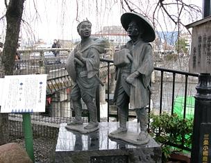 三条大橋のたもとにあるこの像は、十返舎一九が書いた「東海道中膝栗毛」でおなじみの神田八丁堀に住む弥次郎兵衛と喜多八をモデルにしている。二人が伊勢詣を思い立ち、数々の失敗と滑稽を繰り返しながら東海道を江戸から京、大阪に旅する物語である。
