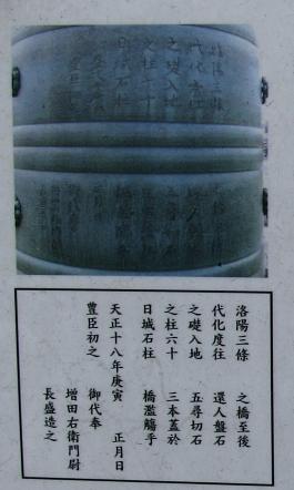 この擬宝珠には色々な事が刻銘されていた。欄干の擬宝珠(ぎぼし)は14個あるらしいが、「石柱橋として初めて架橋。水害による破損に架け替え。朝鮮使節が来日した時に修造」など書かれているようだ。一度、漢文の強い友人と訪れてみたいと思っている。