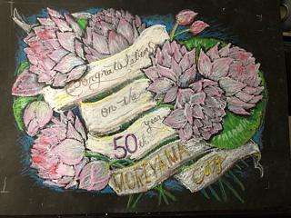 以前子ども達と歌って録音したものに、歌に合わせた絵を描いて、守山市市制施行50周年のお祝いのメッセージも添えました。