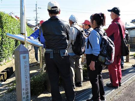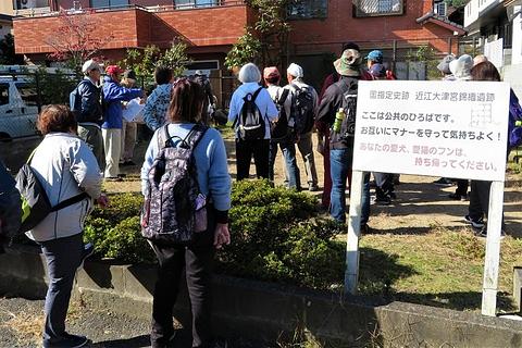 最初は大津宮の史跡第4地点。前の組のとの時間差調整の為、少し長めの中大兄皇子が大津宮へ遷都した背景についての説明を聞く参加の皆さん。