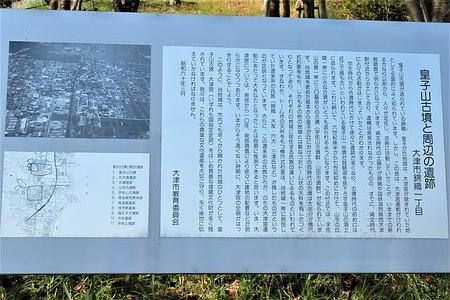 皇子山古墳へ、1号古墳の前方後方墳長さ60mもありこの地方では大きい方。前期古墳時代のものであり、大和朝廷の影響を受けていないとみられる。