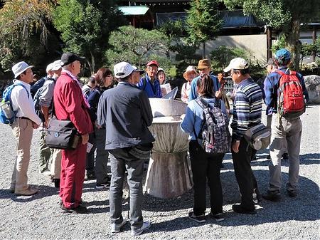 近江神宮にある時計についての説明を聞く参加の方々。 3種類の時計があって興味深い。