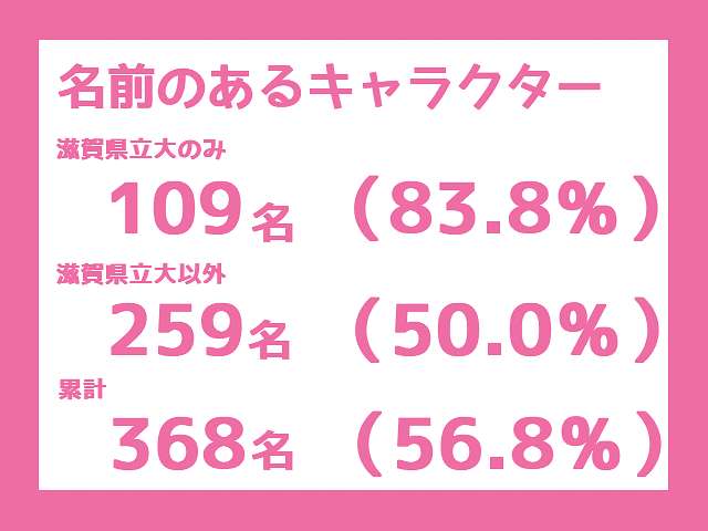 さらに「滋賀県立大のみ」、「滋賀県立大以外」で分けたときの名前のあるキャラクターの数とその割合は