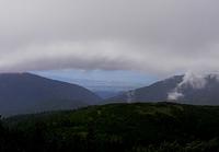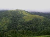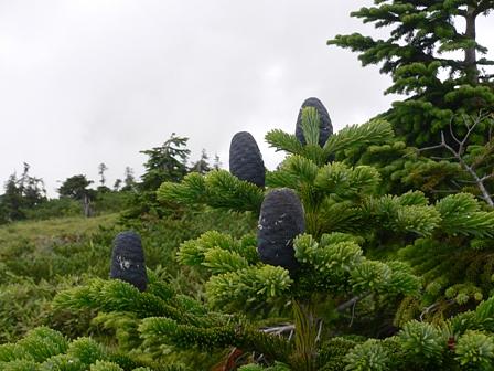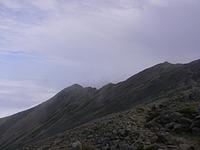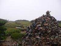 三角点に到達したが、ガスに覆われ視界が利かない。三角点を少し通り抜けると森林限界になり、