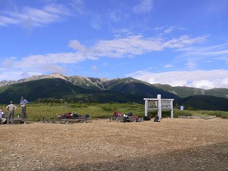 「ふと前を見る」とハイマツで敷き詰められた広大な高原地の彼方に、なだらかな稜線を持つひときわ大きい