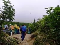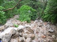登山路は、昨夜から降り続いた雨が鉄砲水となって流れ落ちる水路となっていた。