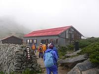 何回も、よろけながら根気、登っていった。遥か遠くに赤屋根の太郎平小屋が見え隠れしてきた。最後は、