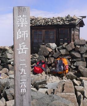 突然、一時的であるが、ガスがなくなり、太陽が射してきた。小社がある薬師如来を祭る薬師岳(2926m)の頂上に立った。 薬師堂のある山頂からは、北東側の展望として立山・剣岳、更に遠くの針の木岳・鹿島槍。東側の展望野口五郎岳・水晶岳のパノラマを楽しみ、眼下の北側に広がる金作谷カール、黒部の渓谷の景観も見ることが出来、満足した。亡き友人にも伝えた。