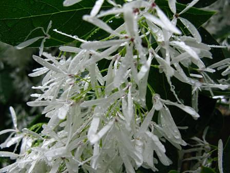 花びらは4枚のようで実は1枚の花びらが四つに裂け、遠目には粉雪をかぶったように咲く。本当の名は「ヒトツバタゴ」の木。変わった形からこの名がつけられた。