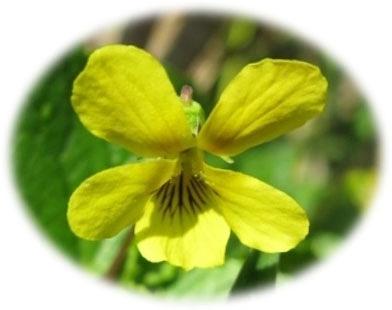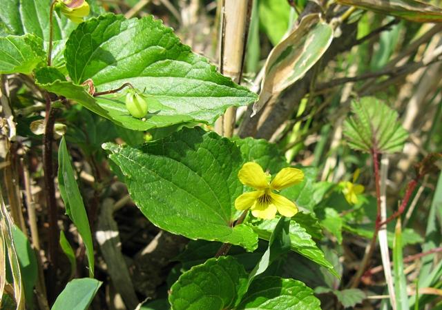 オオバキスミレは、艶やかな黄色で茎に横向きに花を付け、大きな葉っぱの上に花弁が「チョコン」と乗っているように見えました。大きな葉は先端が尖った卵型で、基部はハート型に引っ込んでいました。そして縁に波状のギザギザがありました。既に花も散り実も付けていました。
