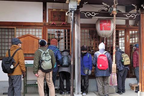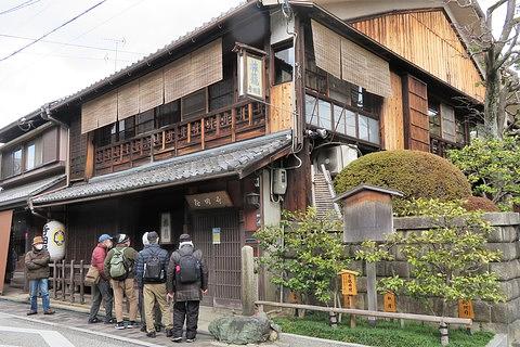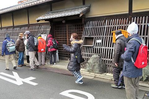 歩きだして直ぐ近くにある鳥羽伏見の戦い時の弾痕跡がある魚三楼へ。話に夢中で行きすぎてしまい、写真は戻って弾痕跡を見ているメンバーです。魚三楼は現在料亭を営んでおられます。