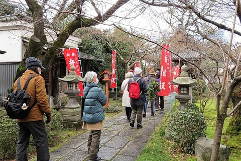 秀吉が作らせたという堀に掛かる弁天橋を過ぎ、長建寺へ。長建寺にはジュディ・オングさんの『山門迎福』との版画があり、唐風の門をくぐると福がやってくるとのことで、皆さんくぐってお参りに。