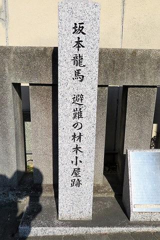 駿河屋さんの横の通りを北に、信号を左折、濠川を渡ったところに龍馬避難の材木小屋跡の碑がありました。 寺田屋で難を逃れた龍馬は両手に傷を負い、隠れたところ。 実際の小屋は筋向いに濠川を渡ったところにありました。