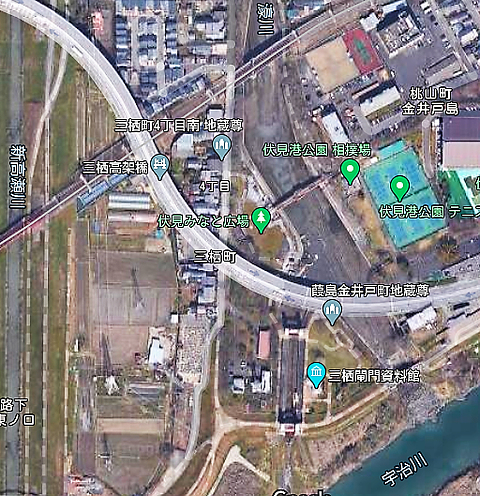 閘門のところで、新高瀬川、濠川、宇治川の位置関係が分からなくなり、ちょっとした議論に。 Google Mapの航空写真で見るとよくわかりました。
