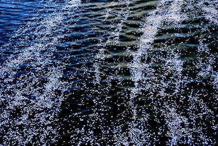 川面を眺めていると、浮いていた花弁が、さざ波に乗って上流に押し戻されていた。