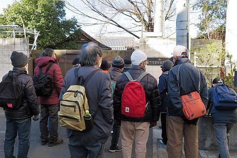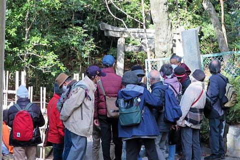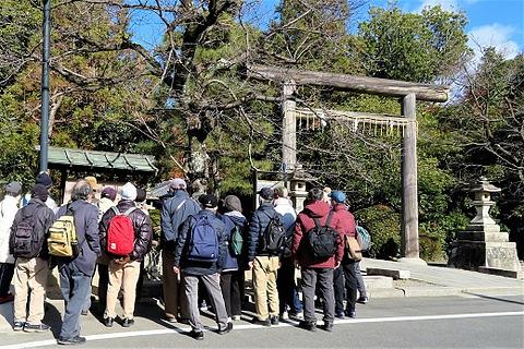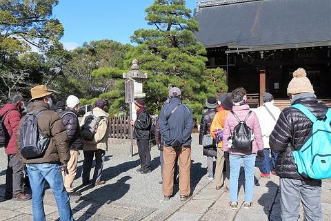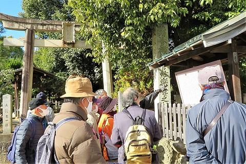 広隆寺のすぐそばにある大酒神社。 大酒神社の謂れ等を聞く参加者。