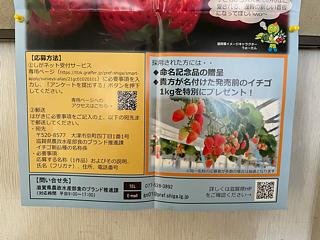 2021年11月25日 イチゴの命名 中川会計 スタッフ • 守山市 詳細 お気に入りに追加 大久保です。先日、仕事で南部振興局に行ってきました。待ち時間に局内を徘徊していたところ1枚のポスターを見つけました。県内産の新品種のイチゴの名前を募集しているものです。採用されると発売前のイチゴが記念品として贈呈されるそうです。芳醇な香りと明るい赤色をイメージさせ、なおかつ滋賀県や琵琶湖を連想させるキャッチーな名前を考えて応募したいと思います。皆さんもこの新品種のイチゴの命名に応募してみてはいかがですか? この記事を報告する 不適切な内容や規約違反を発見した場合はご報告ください