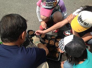 水をしみこませた土の入ったポットに子どもたちが種をまきます。