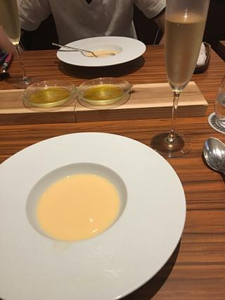 初めにジャガイモとスイカの冷静スープから始まりまして…