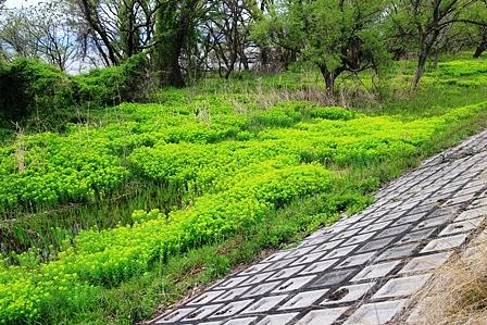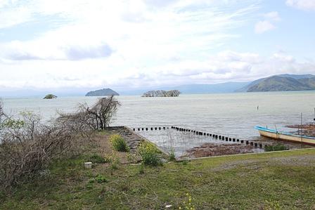 さざなみ街道を北上していくと、湖岸道路添いの河畔の水際には ヨシやヤナギの群落がみられた。この時期になると、ノウルシが周縁の湿地に、柔らかな黄緑に色づいていた。湖岸の原野を代表する植物と言われているだけあって、じゅうたんを敷き詰めたように広がっていた。美しい彩色をしているが、人も寄せ付けないしたたかな植物。葉や茎から出る乳液が皮膚にかぶれを起こすことからして、危険な「漆」という名前が付けられている。春に花をつけるが、夏ごろ、土地が乾いてしまうといつの間にか消えてしまう。