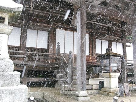 無動寺谷の明王堂にやってきた。ここは、千日回峰行の時の中心のお堂で、不動明王と一体となることを目指す「行」が行われている。この日は、雪が深々と降る中で、総ての障子が閉められていたが、腹に染み入るような読経が辺りに響き渡り、独特の緊張感が漂っていた。