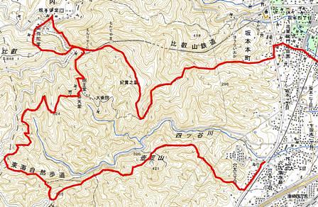 穴太駅~壷笠山~鳥居の柱間のルートが、荒れ気味で、SAリーダーは下見に4回訪れやっと通り抜ける道を見つけたと言っていた。壷笠山へ行くには、四ツ谷川沿いの林道を辿り、少しまわり込めば何てことは無いが、直接、壷笠山へ行く「近江から京へ出る白鳥越え」にこだわったようだ。穴太駅から少し南に向かい住宅街から山中に入り、山腹を巻く様にして壷笠山北側の鞍部に出るコースである。