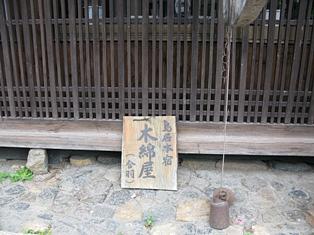 この近くに、もうひとつの名産合羽を商っていた家があった。「本家 合羽所 木綿屋 嘉右衛門」と記した看板が今でもぶら下がっていた。山中の雨の多い木曽に向かう旅人にとっては、ここで合羽を買い求めたのであろう。ここの合羽が有名になったのは、従来の「こうぞ」を原料にした紙に菜種油を使用していた。新しく柿渋を塗布し保温、防水としての機能を高めたそうである。雨の降りやすい山道を控えている鳥居本宿にふさわしい名物となった。