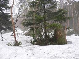 峠は、まだ残雪に覆われていたが、 木々の根付の温もりから、既に雪が融けはじめ、春を告げていました。木の根の周りから融けていくことを俳句の季語で「木の根明く」というそうです。