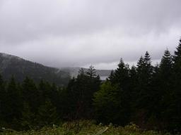 針葉樹林帯が少なくなり、峠らしいところを越えると沼山展望台に着いた ここからは、尾瀬沼湖の湖面・大江湿原が、かすかに見下ろせたが、残念ながら、周辺の山々は、ガスに覆われいた。さらに、木道を下って行くと、大江湿原にでた。