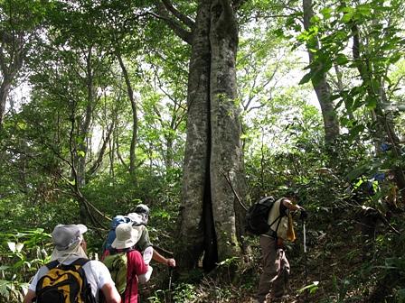 二等三角点がある大黒山の頂上は、雑木が生い茂り、見晴らしが利かない。一休みしてブナ林の森の中を進んでいくと、二本の木が繋がったようなブナの巨樹が現われた。この木は、すらりと空に向かって「すくすく」と伸びていた。