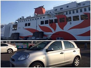 昨晩、神戸港からフェリー「さんふらわあ」に乗船し、大分港に着きました。これからレンタカーで熊本に入ります。