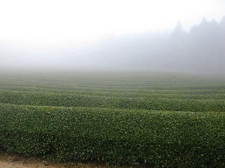 4日後の11月16日(土)、鈴鹿の三子山・四方草山に山仲間と出掛けた。鈴鹿峠へ、いつ来ても、茶畑が見事だ。綺麗に刈り込みされた茶畑の曲線がうねうねと重なり奥の方に続いていた。人工的な幾何学模様のようだ。 土山地区は鈴鹿山系と近くを流れる野洲川によって霧がよく発生し、 この霧や朝晩の気温差が、お茶栽培に適しているのであろう。この日も、晴れの予測であったが、朝霧に包まれ幻想的な光景が広がっていた。