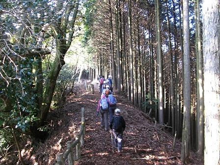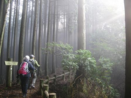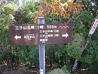 三子山に向け、整備された東海自然歩道の階段を登っていった。さわやかな朝日を受けながら、植林地の中、気持ち良いスタートだった。ほぼ1時間で、一つの峰、次に二つ目の峰とアップダウンを繰り返、いつの間にか、三つ目のピークに到着。ガイドブックによると、三子山は北峰・中峰・南峰として案内されているが、標識板には、洒落たローマ数字を使用し、Ⅰ峰・Ⅱ峰・Ⅲ峰となっていた。多分、「鈴鹿の山と谷」著者西尾寿一氏が仮に名づけた名称が定着したようだ。