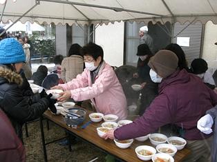 前日は、老人会・子ども会などの女性軍が各自まな板、包丁などを持ち込んで下こしらえの準備に大忙し。当日は朝早くからせっせと炊き込み、抜かりがなかった。訓練が終わり次第の参加者に熱々のトン汁を振舞っていた。寒い中、かなりの好評であった。訓練を計画された自治会の関係者は、降雪の中であったが、望外の参加者数とスムーズに運営できたことにほっとされ、トン汁をすすっていた。