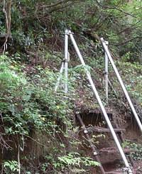 そうこうしていると、壊れかけた鉄の梯子が取り付けられていたが、手が付けられないほど傷んでいた。 さらに進むと、手摺り付きの梯子が斜面に取り付けられていた。ここが、安蔵山の取り付き点である。 階段を上がるといきなりの急登。急斜面には多数のパイプが階段状に連続に打ち込まれ、ところどころにトラロープが張られていた。途中パイプが抜け出したり、ロープが切断箇所もあったが大いに助かった。細いパイプを踏み台にして登っていくと30分ほどP467mのピークに立った。地図からすると、標高差は200m、直線