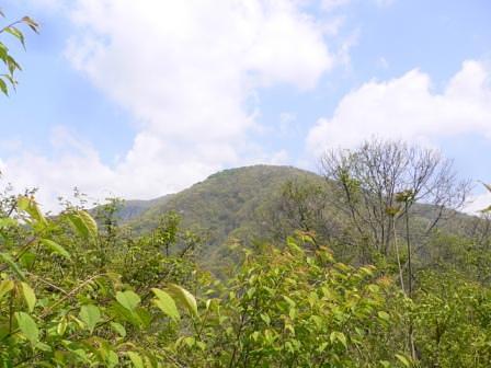 P467m からは、登山路は踏み跡程度になったが、ブッシュは、たいしたことなく進めた。ただ、戻り枝尾根に紛れ込まない様に、所々にテープを巻きつけて行った。少し右に巻くようにして40m程度下り、少し切れ込んだ鞍部に着いた。ここから、山頂上から南々東に向かって真っ直ぐ張り出している主尾根を辿っていった。緩やかな登りが始まった。