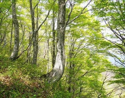 手付かずのミズナラとブナ林が出現した。原生林そのままで見事であった。