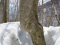 春先の森林帯は、雪が辺り構わず均一に解けていくと思われるが、そうではない。立ち木のまわりの雪がいちはやく解ける奇妙な光景が出現していた。