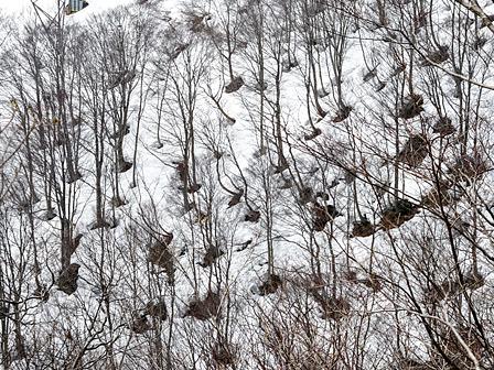残雪の森林帯の至る所の樹々の周りにドーナツ状に丸い窪地が現れる。それぞれの樹々の周りの雪が大きく解け出し、いずれ隣り合った根回り穴は消え、地肌となって行くのだ。この時期にしか見られない春の美しい一景である。