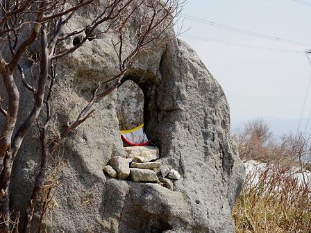 ところどころに石畳の古道があるところだが、すっかり雪に埋まっていた。ただ、約2.5mの自然石をくり抜いた石仏は、雪も被らずにょきと突っ立っていた。
