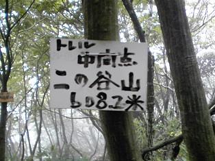 最後の山頂稜線を登り詰めると山頂手前の道標(左方向桜峠、右二の谷山山頂)が立っていた。更に山頂に到着。この頂は、一方が自然林、反対側にヒノキの植林で覆われ、三角点の標石があるだけの平凡なものであった。だが、ここが高島トレイルの中間点であることを意識した。