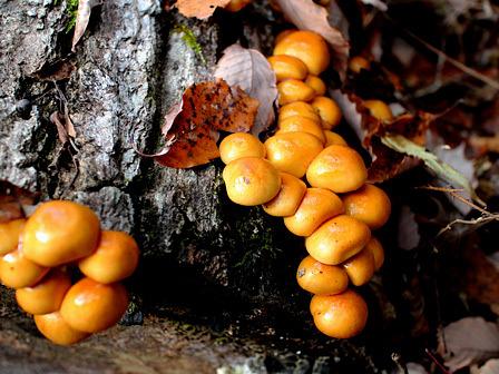 道端に放置されていた短い切株に、ナメコがびっしりついていた。