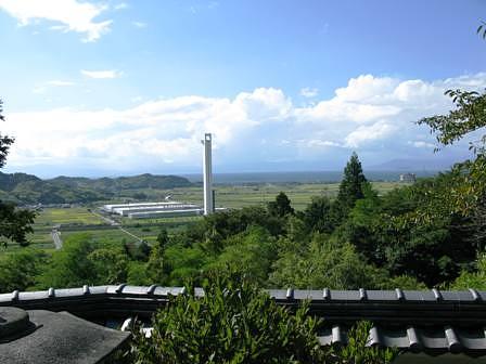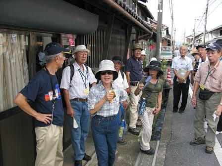 人通りも殆どないところに、大勢が詰めかけたものだから、望湖堂の田中さんが気を利かして敷地内の庭に招いてもらった。手入れされた庭から眺める風景は、エレベータ会社・フジテック彦根工場の実験搭(高さ170m)や琵琶湖や湖東平野がよく見え、一味変わった風景であった。
