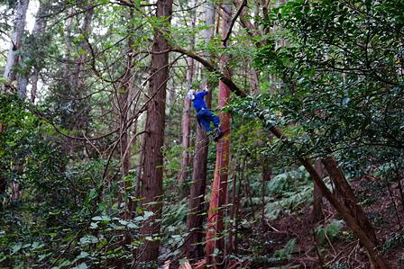 木によじ登るのは、短棒2本にロープを結びつけただけの簡単な道具である。 目線に短棒を幹に対して横にあてがって、ロープで結ぶのではなく巻き付けていた。