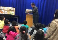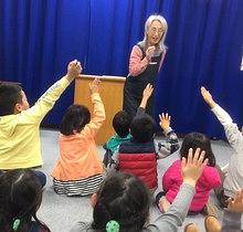「鼻の横はー」「みみ」と問いかけ絵本を読んだ後、