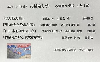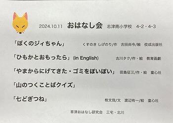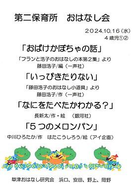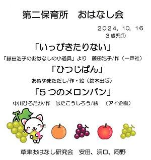 2024年10月17日 10月前半キャラバン 草津おはなし研究会 • 草津市 詳細 おはなし会《保育園(所)・幼稚園》 おはなし会《小学校》 小学校 幼稚園 保育所 お気に入りに追加 10月8日(火)信愛幼稚園5歳児10月11日(金)志津南小学校4年生1組2,3組10月16日(水)草津第二保育所3歳児4歳児 この記事を報告する 不適切な内容や規約違反を発見した場合はご報告ください